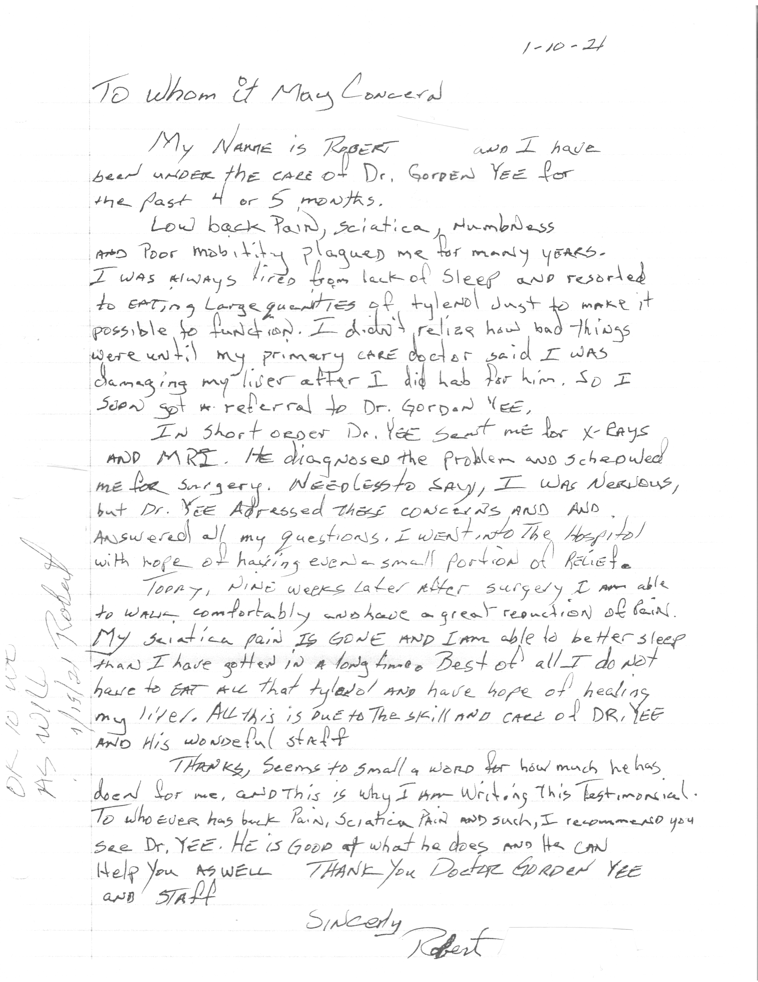 “I have been under the care of Dr. Yee for the past 5 months. Low back pain, sciatica, numbness, and poor mobility plagued me for many years. Nine weeks after the surgery I’m able to walk comfortably… I recommend Dr. Yee is good at what he does and he can help you as well, thank you, Dr. Gordon Yee and staff”