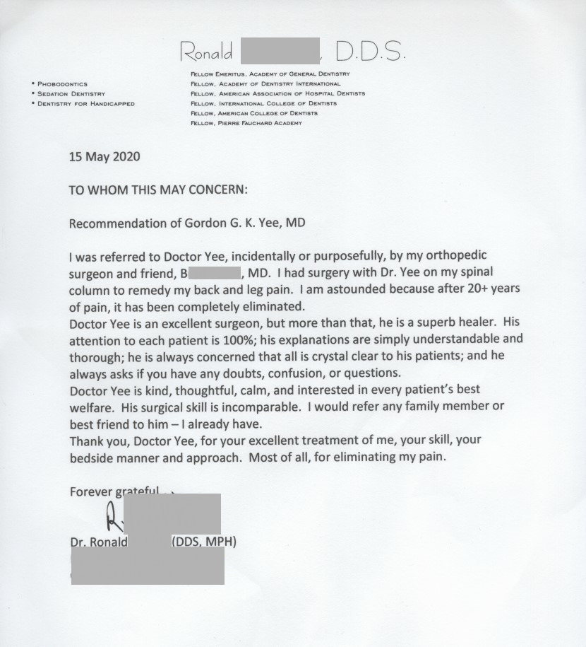 “I was referred to Doctor Yee, incidentally or purposefully, by my orthopedic surgeon. I had surgery with Dr. Yee on my spinal column to remedy my back and leg pain. I am astounded because, after 20 years of pain, it has been completely eliminated.”